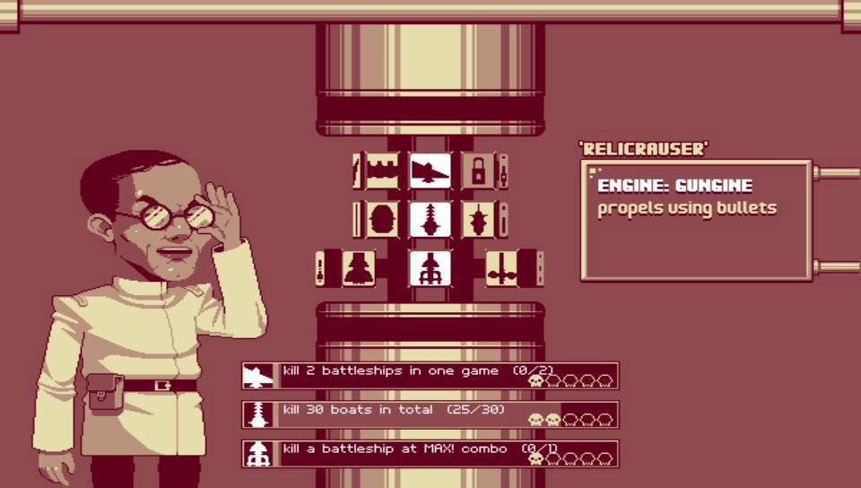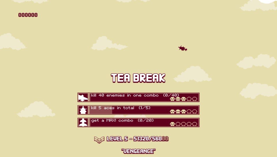 Ihr startet als Level 1-Pilot relativ gemächlich. Jedes der zehn Level besitzt neue Herausforderungen, sei es in Form von neuen Gegnertypen oder Challenges. Für jede der drei Bereiche eures Flugzeugs erhaltet ihr Herausforderungen, die auch das ausgewählte Bauteil ausgelegt sind (die obigen Screenshots zeigen das Ausrüstungsmenü und die Herausforderungen). So sollt ihr mithilfe des mit Bomben modifizierten Rumpfes (ihr werft automatisch beim Feuern der Hauptkanone regelmäßig Bomben ab) ununterbrochen feuern und dabei 30 Gegner eliminieren. Erfüllt ihr diese Ziele, erhaltet ihr Totenköpfe, welche euch wiederum neue freischaltbare Teile bescheren. Diese gelungenen und spannenden Herausforderungen und die Jagd nach neuen coolen Gadgets für euer Flugzeug macht die Hauptmotivation von Luftrausers aus. Diese Ziele könnt ihr frei nach Luft und Laune (kleiner Scherz) erledigen, doch am Ende gilt es ein riesiges Luftschiff zu zerstören, um an weitere Unlocks für alle Teile zu kommen.