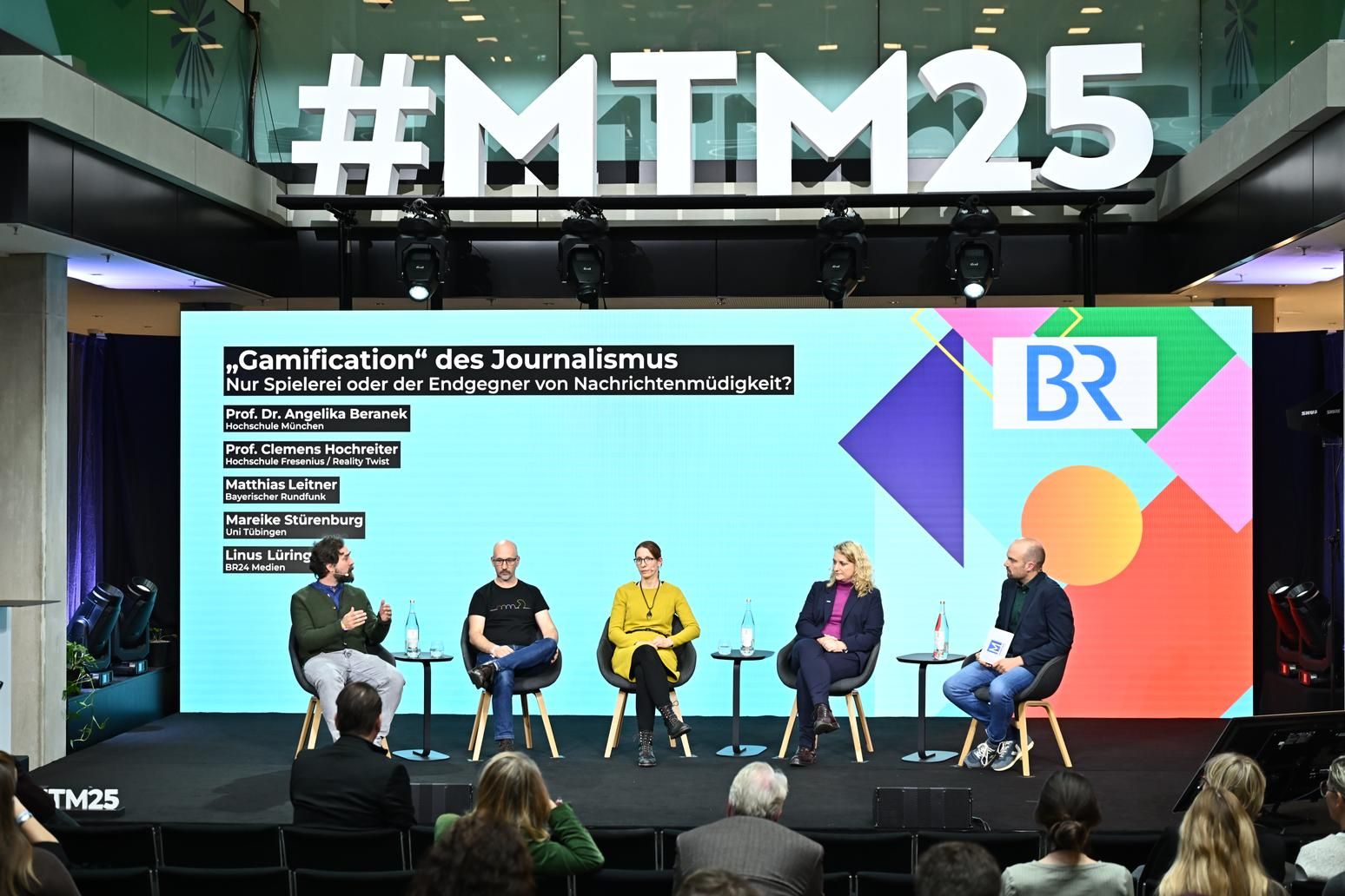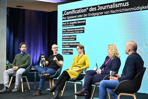 Im Panel „‚Gamification‘ des Journalismus – Nur Spielerei oder der Endgegner von Nachrichtenmüdigkeit?“ haben sich Prof. Dr. Angelika Beranek, Professorin an der Hochschule München und Leiterin des Media Culture Labs, Prof. Clemens Hochreiter, Professor an der Hochschule Fresenius und Co-Geschäftsführer des Entwicklerstudios Reality Twist, das sich auf dokumentarische Spiele spezialisiert hat, Clemens Leitner, Leiter des Storytelling Labs „Audience First“ beim Bayerischen Rundfunk und Mareike Stürenburg, Institut für Rechtsexremismusforschung an der Universität Tübingen zusammengefunden. Dem von Linus Lüring (BR24 Medien) moderierten Panel hat es an einem klar definierten Thema gefehlt. Immer wieder wurden unterschiedliche Begriffsdefinitionen für „Gamification“ artikuliert und verschiedene Themen wie Nachrichten auf Social Media, Games-Journalismus, Spieleentwicklung und der Zusammenhang zwischen Spielenden und Rechtsextremismus (Fazit: Es gibt keine keinen.) kurz angerissen, ohne dabei in die Tiefe zu gehen.