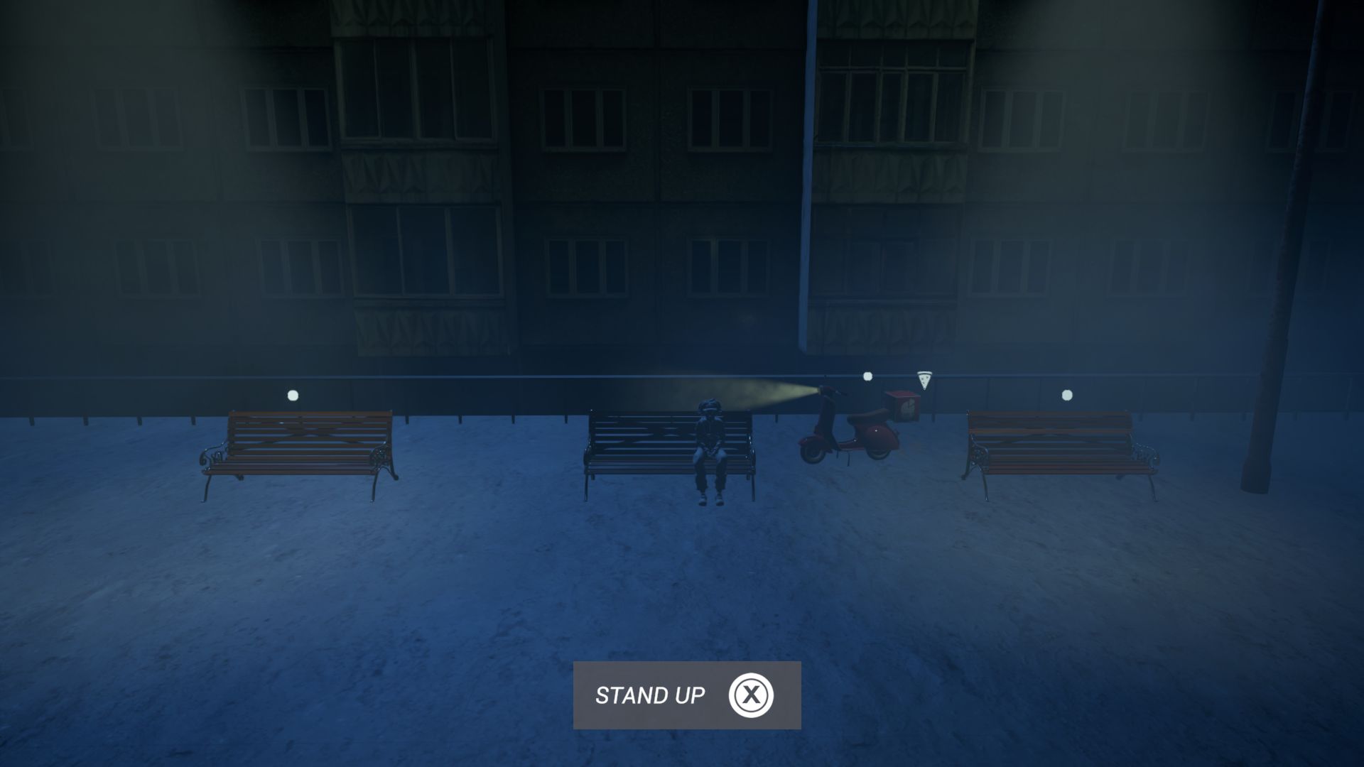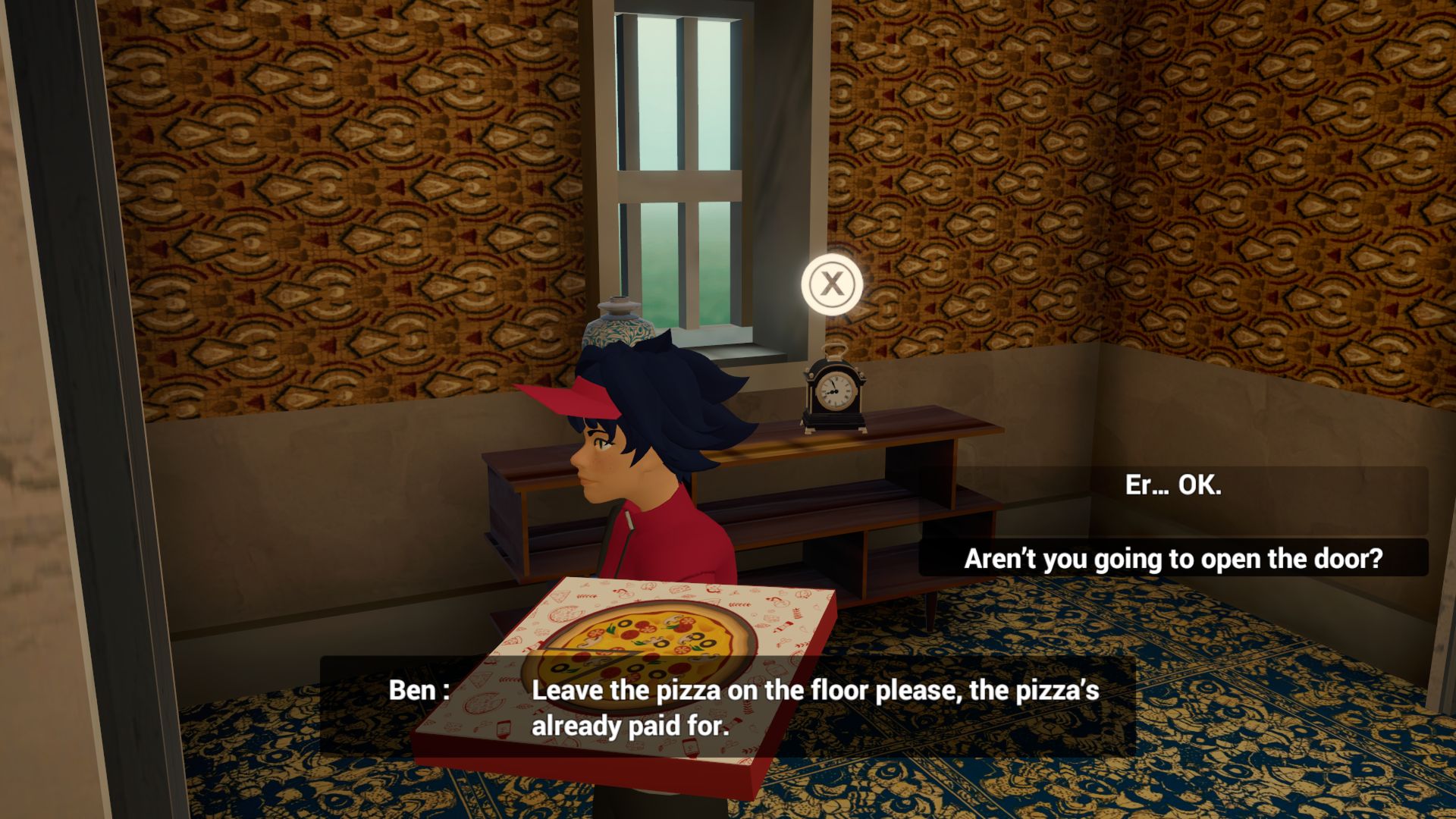 Die passend zu ihrer gleichfarbigen Vespa in lila gekleidete Protagonistin B versucht in einem Mehrfamilienhaus mit auffälliger Tapete eine Pizza bei Ben zuzustellen, der allerdings partout die Wohnung nicht verlassen will. Wir können uns entweder damit abfinden oder noch einmal nachfragen, ob er nicht aufmachen will. Diese rudimentären Entscheidungen gibt es immer wieder im Spiel und je nachdem was wir auswählen, erhalten wir vielleicht eine zusätzliche Dialogzeile, doch mehr Einfluss scheinen wir dadurch nicht auf den Fortlauf der Geschichte nehmen zu können. Nachdem wir die Pizza mit der Dreieckstaste vor der Wohnungstür abgelegt haben, werfen wir einen Blick auf die antike Uhr auf einem Regal vor dem Fenster – einer von zahlreichen Gegenständen, die scheinbar mit uns selbst in Verbindung zu stehen und uns an vergangene Tage erinnern lassen, sei es die Lieblingsschallplatte unserer Eltern oder ein Schnuller der Nichte. Wir verlassen den Komplex und realisieren, dass wir mitten im Nirgendwo sind. Über eine Telefonzelle erhalten wir von unserem Boss Earl den nächsten Auftrag. Das fühlt sich ein bisschen wie ein Spin-off des Pizza Dudes in Hotline Miami an. A Pizza Delivery führt uns zu fantasievoll gestalteten Schauplätze wie eine düstere Stadt, in der wir von Asche bedeckt werden, sobald wir uns auf eine Bank setzen, einen in einem malerischen Küstengebiet angelegten Friedhof und ein von Polarlichtern erhelltes Fabrikgelände.