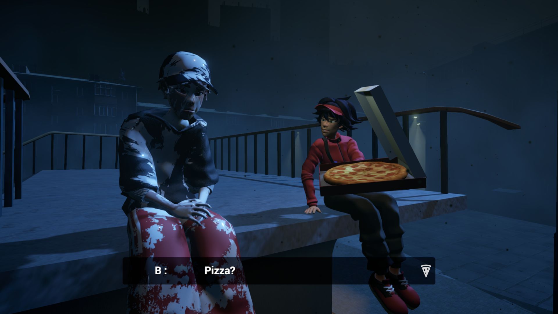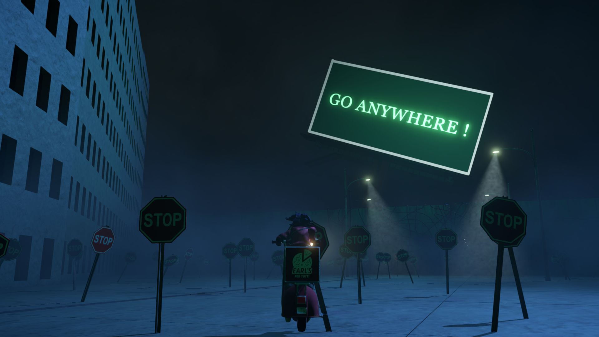 Auf unserer Reise können wir neben Erinnerungsobjekten auch Tagebuchseiten von anderen Pizzaboten und bis zu acht Spieluhren finden, die allerdings immer die gleiche Melodie von sich zu geben scheinen. Das Geschehen wird von einem stimmungsvollen Soundtrack von LaFrancesssa untermalt. Auch wenn die Umgebungen vor interessanten Details strotzen – etwa als wir ein riesiges „GEH WOHIN DU WILLST !“-Schild am Firmament erblicken während uns darunter zahlreiche Stoppschilder den Weg versperren -, wirken sie doch teils etwas zu leer und trist. Die Gespräche mit den Kundinnen und Kunden sind kurzweilig und schneiden immer wieder interessante Themen an. So treffen wir auf dem Dach des verlassenen Fabrikgebäudes auf die rothaarige mit Sommersprossen und Tattoos übersäte Pora, die von ihren Eltern verstoßen wurde, weil sie nicht deren Erwartungen entspricht. Am Strand flitschen wir in einer Abfolge von Quick-Time-Events mit einem Gitarre spielenden Wanderer mit roter Mähne, der mit schweren Schicksalsschlägen zu kämpfen hat, Steine um die Wette. Die optionale Zustellung eines Stücks einer zwar trockenen, aber eiskalten Pizza lässt uns mehr über die Charaktere erfahren und sie kurzzeitig ihren Frieden finden. Die Anzahl der Charaktere, auf die wir im Spiel treffen, lässt sich allerdings an einer Hand abzählen und nach einer Stunde – oder weniger – ist das Abenteuer auch schon vorüber.