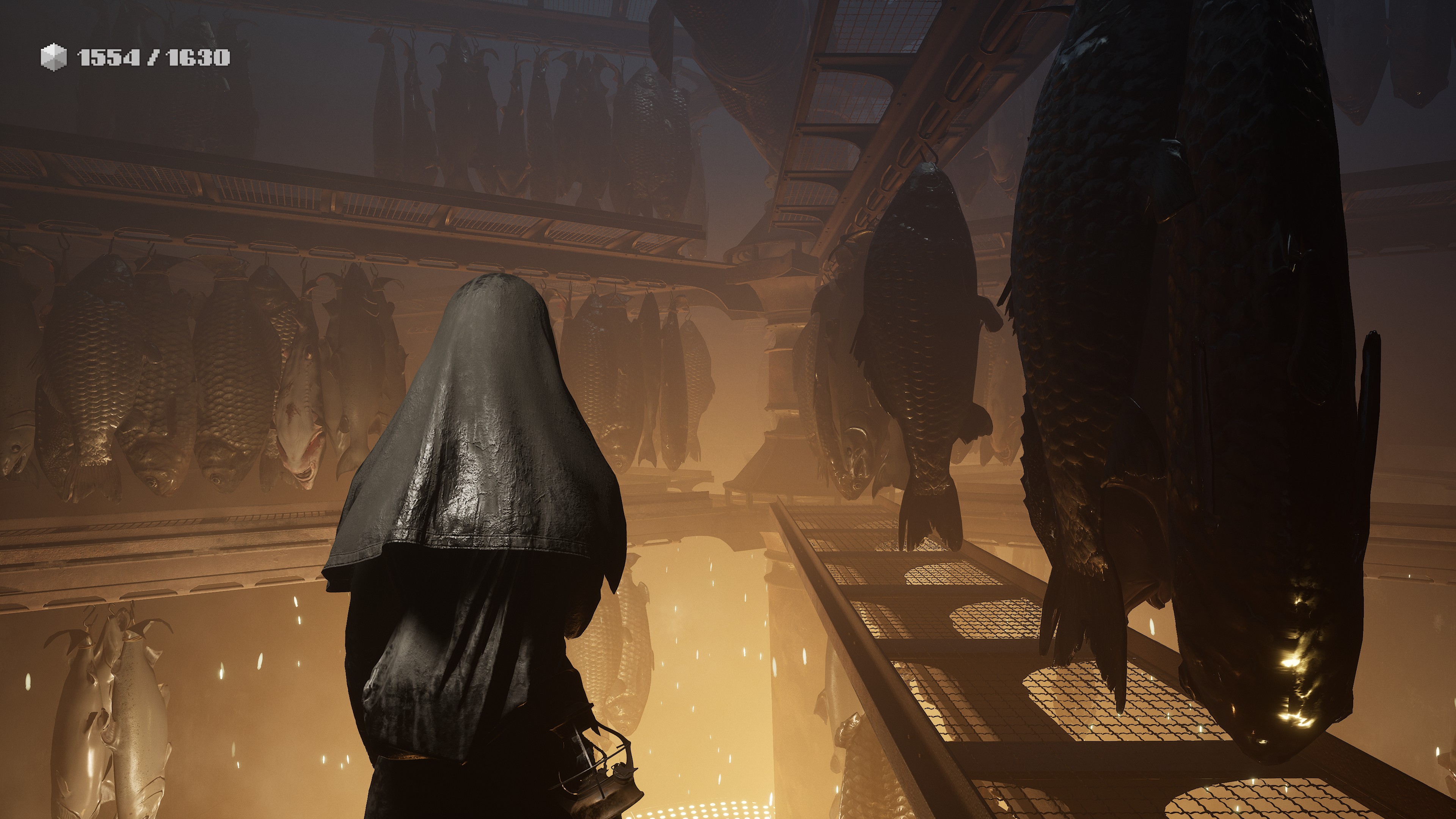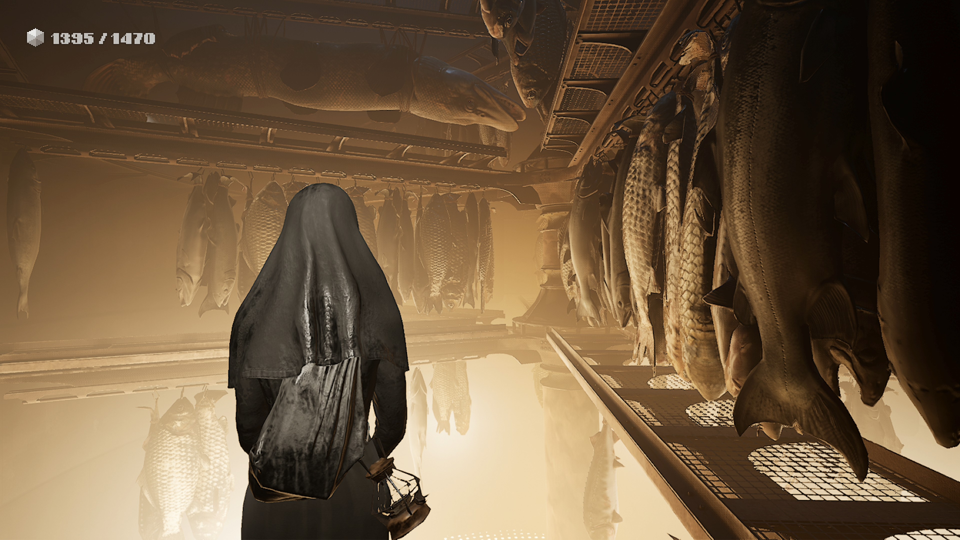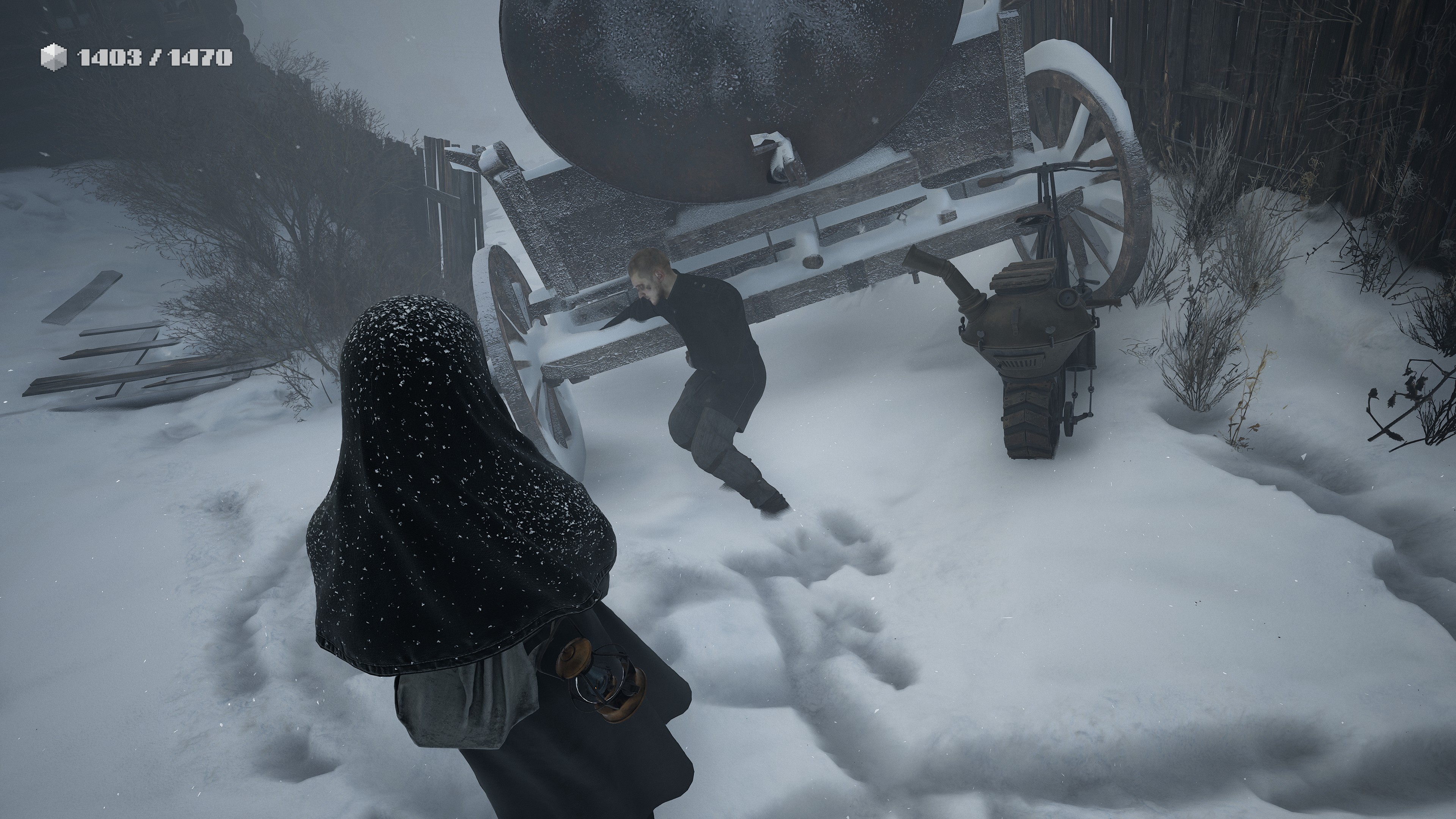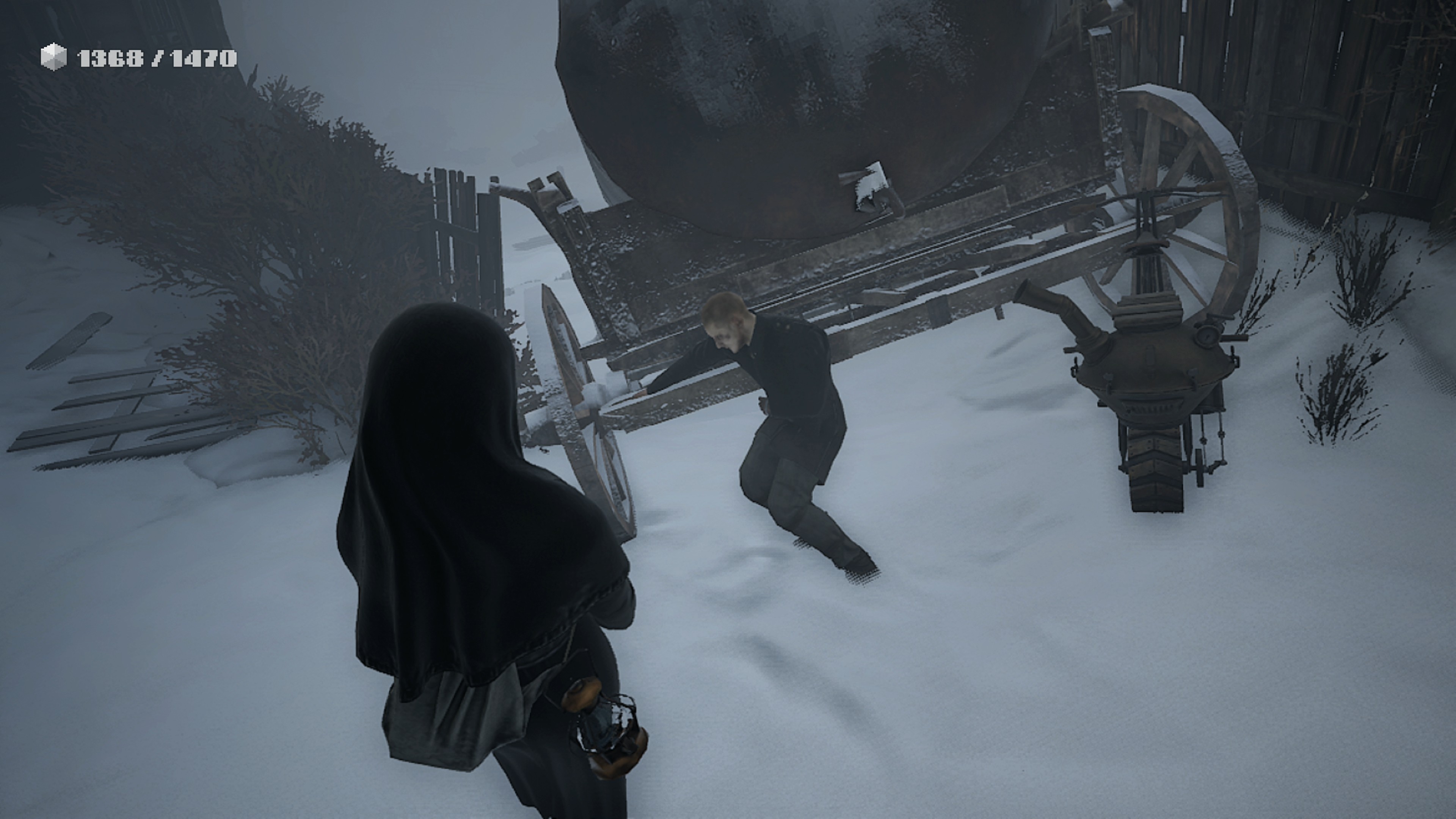 Spielerisch handelt es sich bei INDIKA um einen Walking-Simulator aus der Verfolgerperspektive mit einigen Rätsel- und Jump’n’Run-Elementen. So erkunden wir die architektonisch interessant gestalteten Schauplätze des Spiels wie ein verschneites Dorf, dessen Häuser allesamt etwas schief und monströs groß aussehen. Als wir inmitten dessen fünf Mal händisch Wasser vom Brunnen holen sollen, obwohl es gleich nebenan eine funktionsfähige Pumpe gibt, fühlt man sich wirklich wie ein kleines Rädchen in einer unverständlichen Maschinerie. Das ein oder andere Umgebungsrätsel lockern die Spielmechanik auf. Während der Teufel mit Hasstiraden buchstäblich unsere Umwelt zerreißt, können wir sie nur durch Beten und geschickte Navigation zusammensetzen, um voranzuschreiten. Des Weiteren verwenden wir unterschiedliche dampfbetriebenen Maschinen, um in der Spielwelt voranzuschreiten. Nachdem wir uns den Weg durch Unmassen an riesigen abgehangenen Fischen gebahnt haben, reihen wir mit einem Stapler überdimensionale Fischkonserven aufeinander, um das höher gelegene Ziel zu erklimmen und versetzen auf einer unfertigen Baustelle ganze Brücken mit einem Kran. Anders als in anderen narrativen Abenteuern müssen wir hier nicht ständig Quick-Time-Events vollführen, sondern können uns in den Filmsequenzen ganz auf das Gezeigte einlassen.